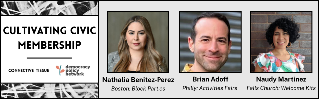 On Thursday, September 25th from 4 PM to 5:15 PM ET, join The Democracy Policy Network and Connective Tissue for an interactive panel and workshop on cultivating civic “membership.”